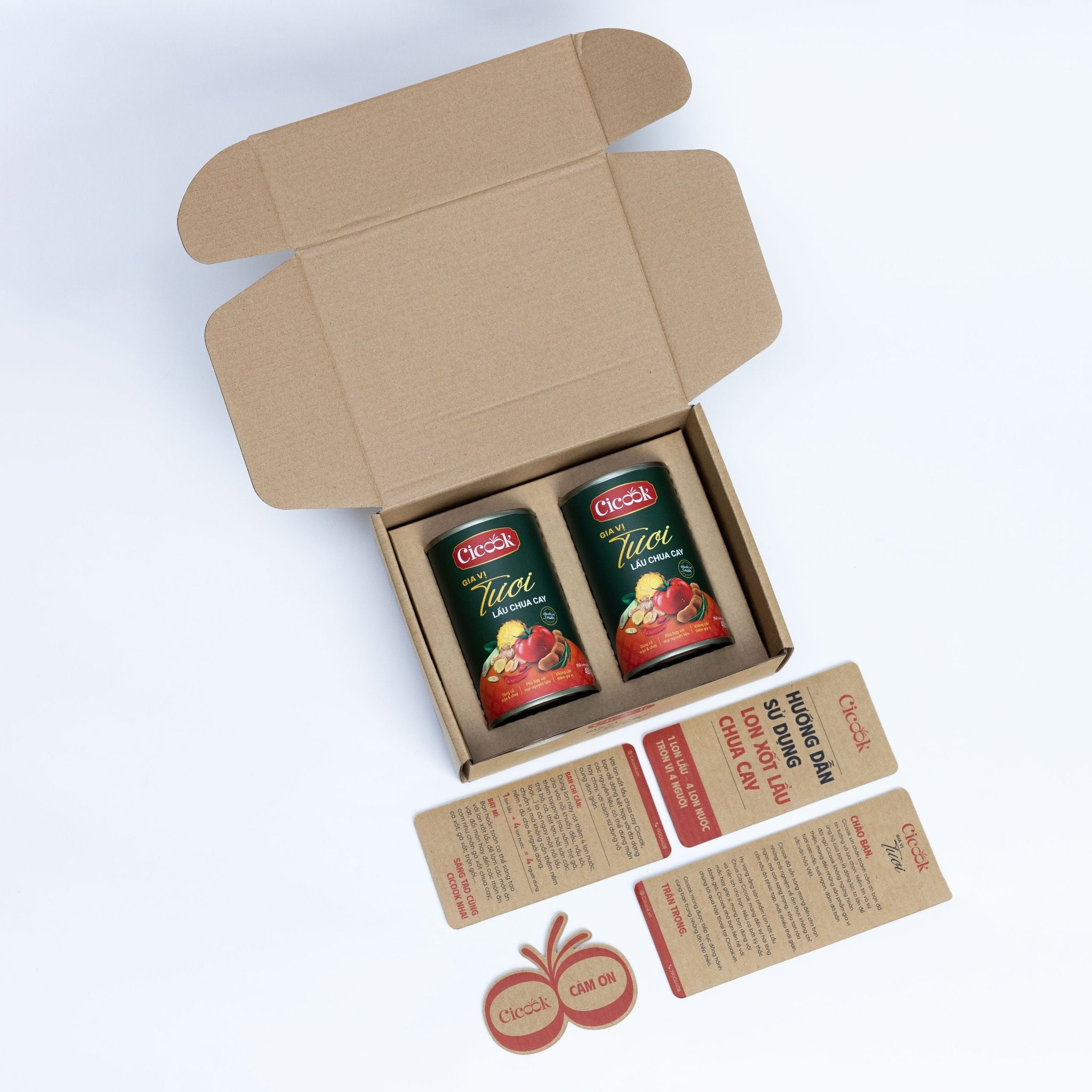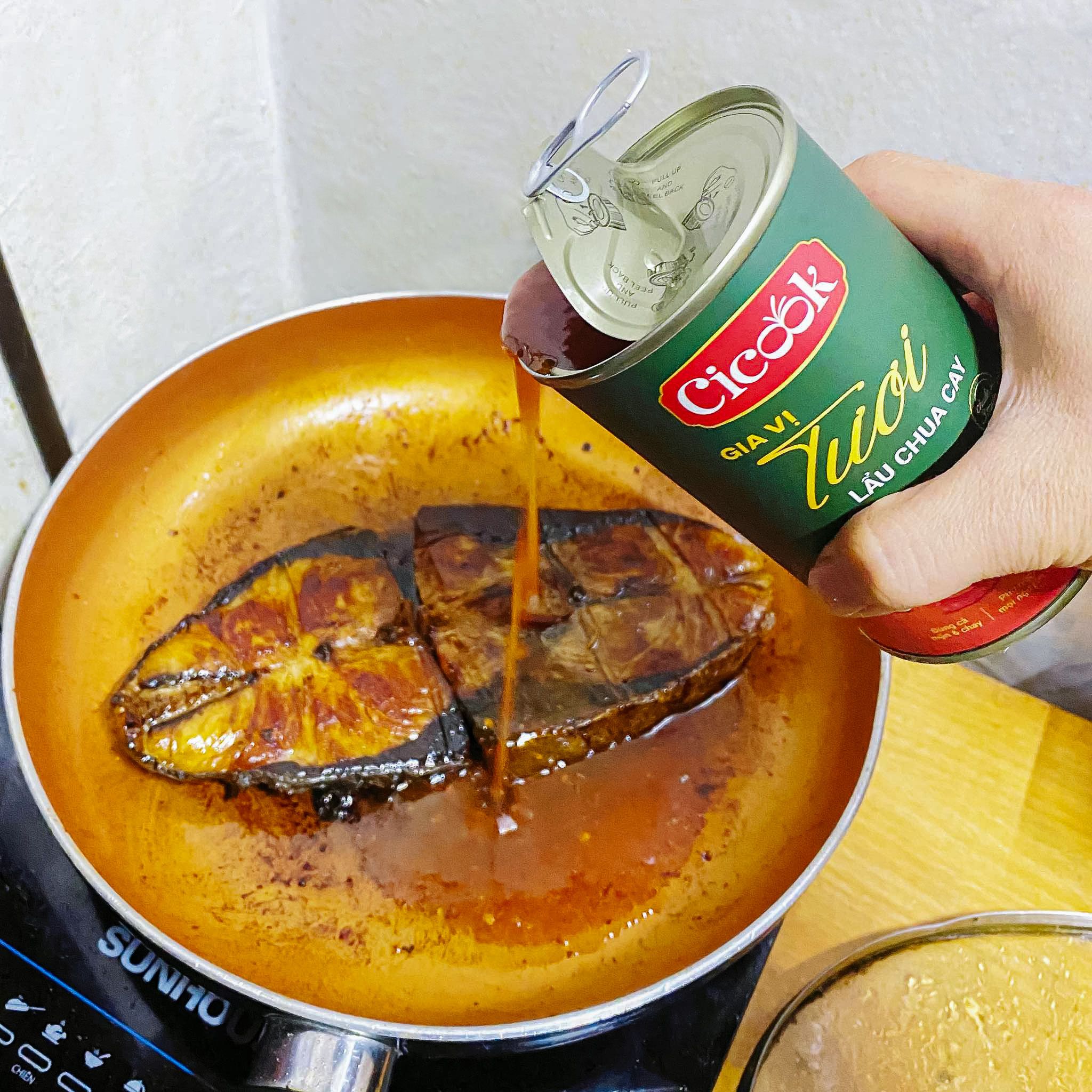 - Chuẩn bị nồi lẩu, đổ 1 hoặc 2 lon xốt lẩu chua cay Cicook vào nồi (tùy khẩu phần).